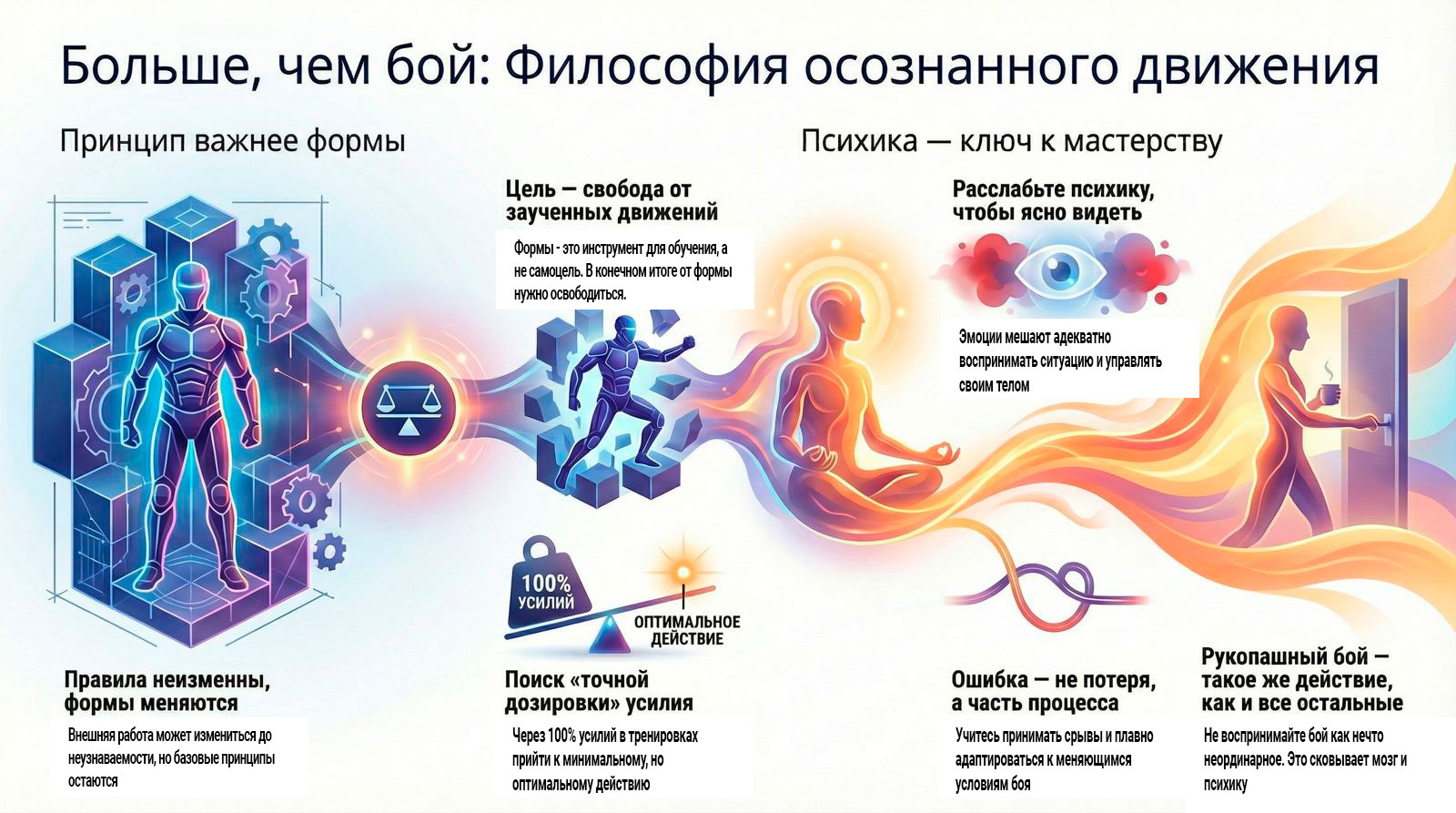 Система опирается на принципы триединства сил — физических, духовных, интеллектуальных, что позволяет достичь гармонии между телом и умом.